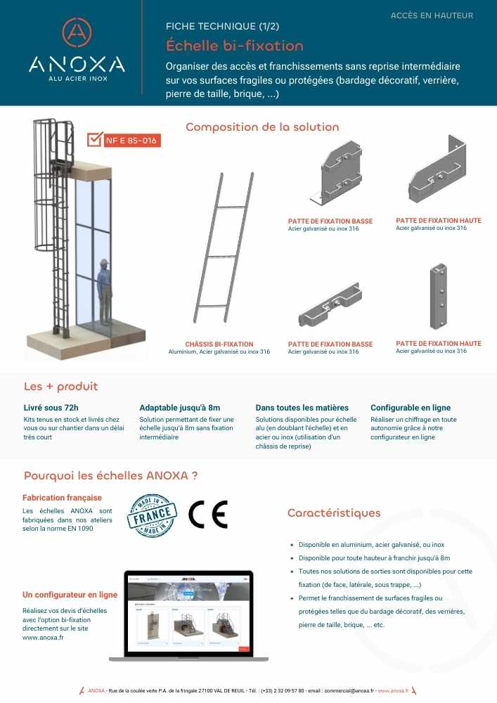 Anoxa offre depuis plus de 70 ans des solutions d’accès sécurisés & d’équipement de protection collective. Spécialiste de l’accès et de la circulation en toiture, nous concevons et fabriquons nos échelles dans notre atelier «Made in Normandie».